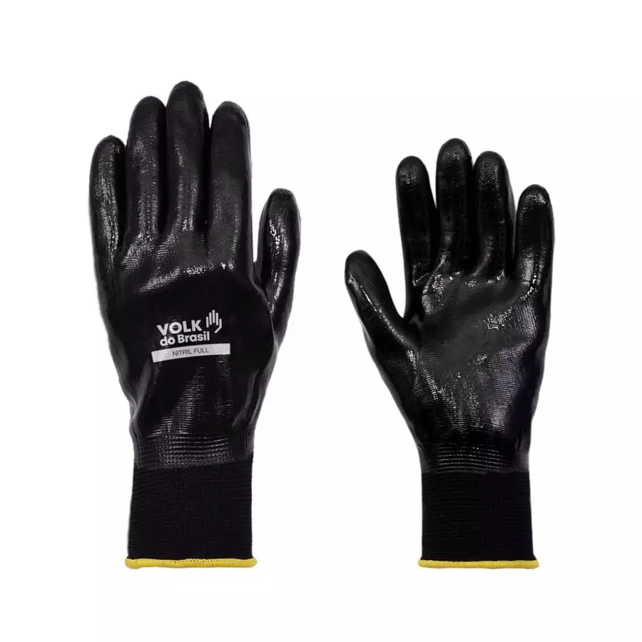 Luva de segurança confeccionada em fibras sintéticas, totalmente revestida com nitrila, lisa, punho em fibras elásticas e acabamento em fibras sintéticas.