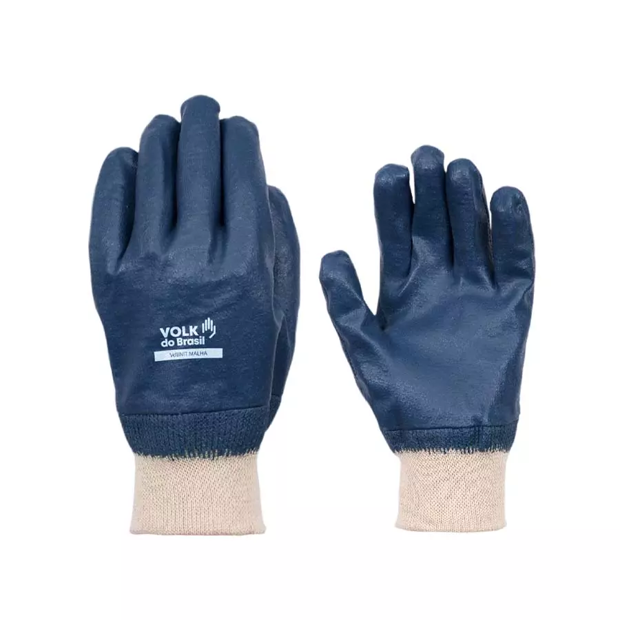 Luva de segurança confeccionada em fibras naturais, tipo “interlock”, totalmente revestida em nitrila, lisa, punho de malha.