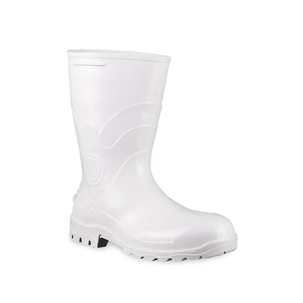 Bota ocupacional impermeável confeccionada em policloreto de vinila (PVC), com solado com ranhura no salto, fácil limpeza e que retarda a passagem de temperatura. Altamente resistente a bactérias, ambientes refrigerados, ácidos, óleos e solventes. Estrias laterais que facilitam o calçar.